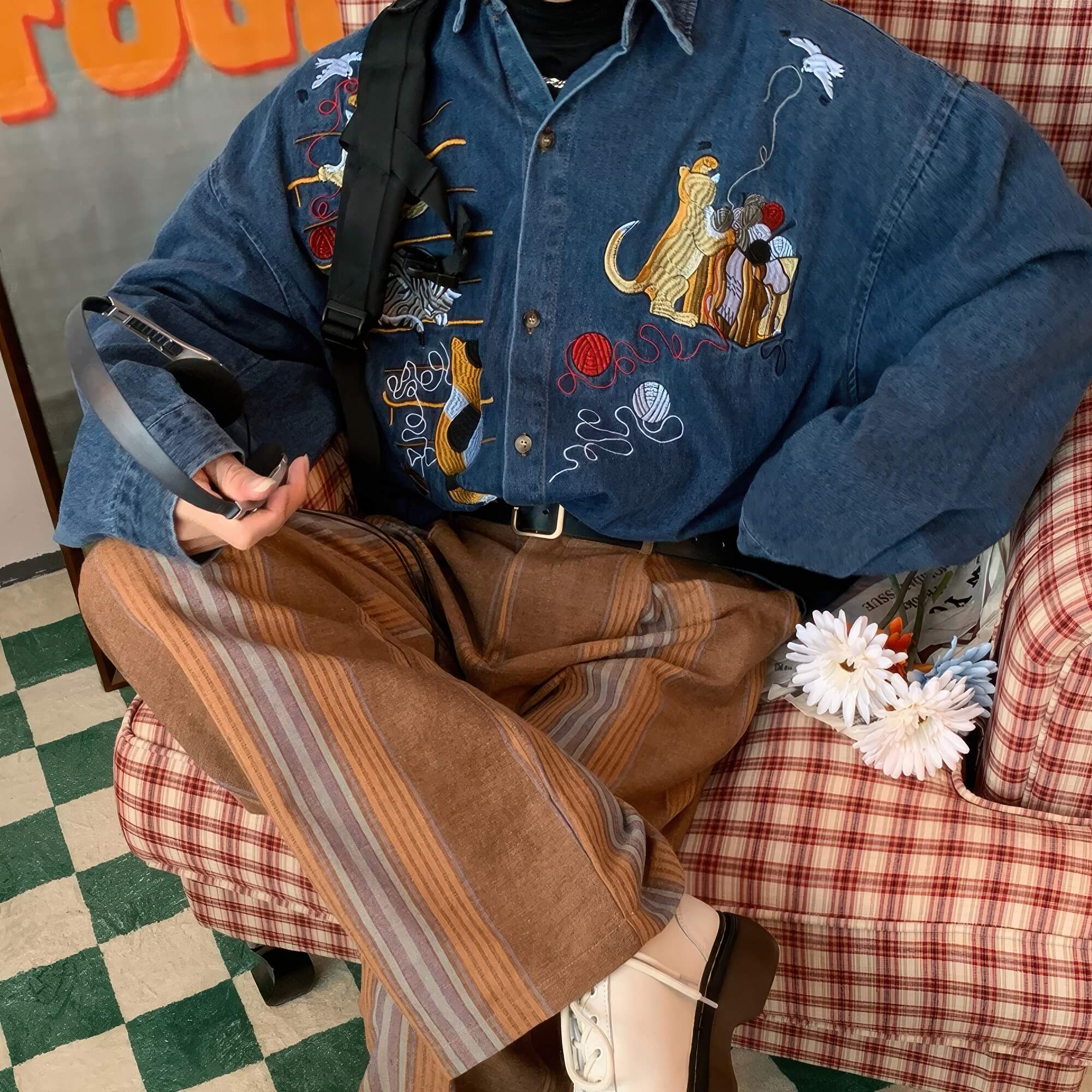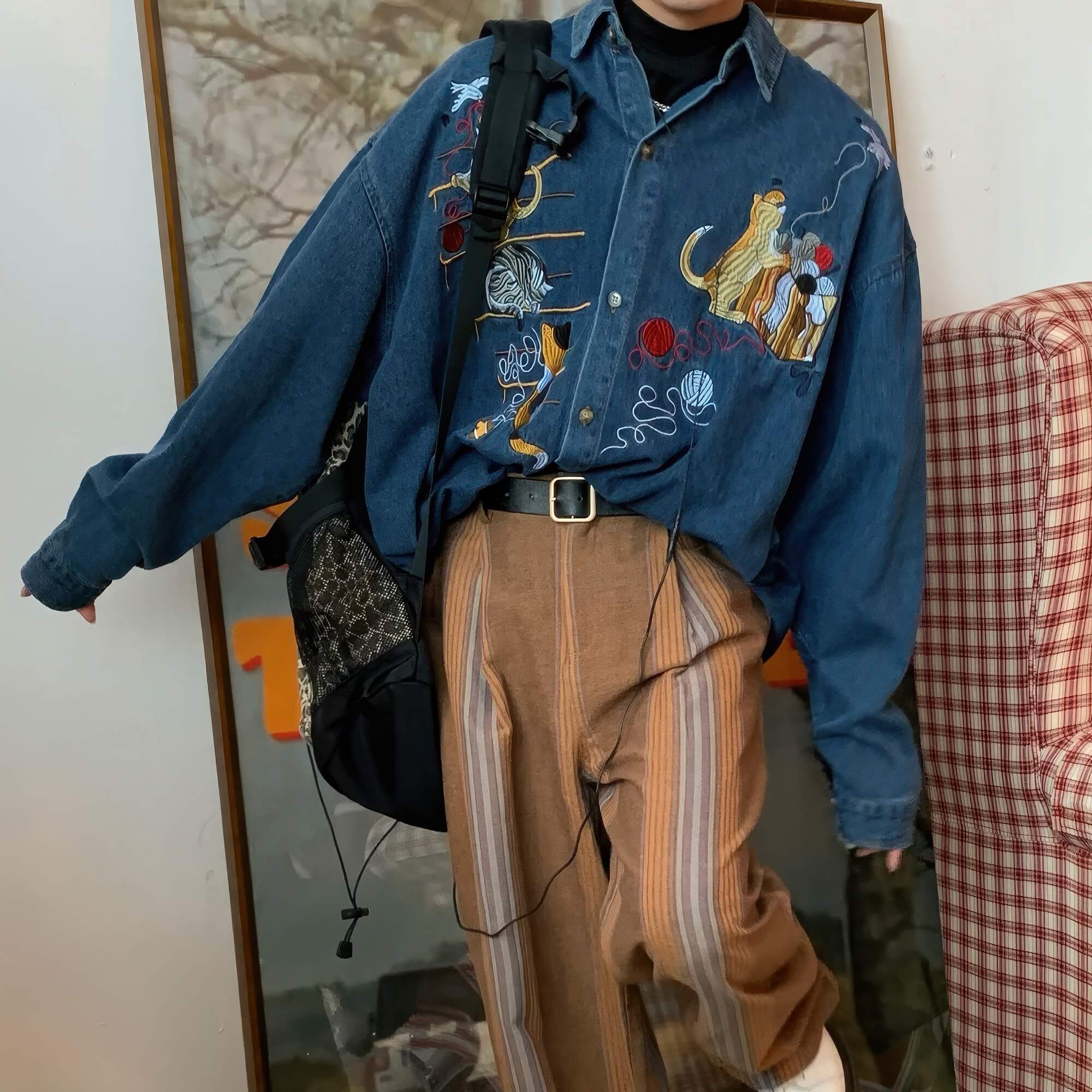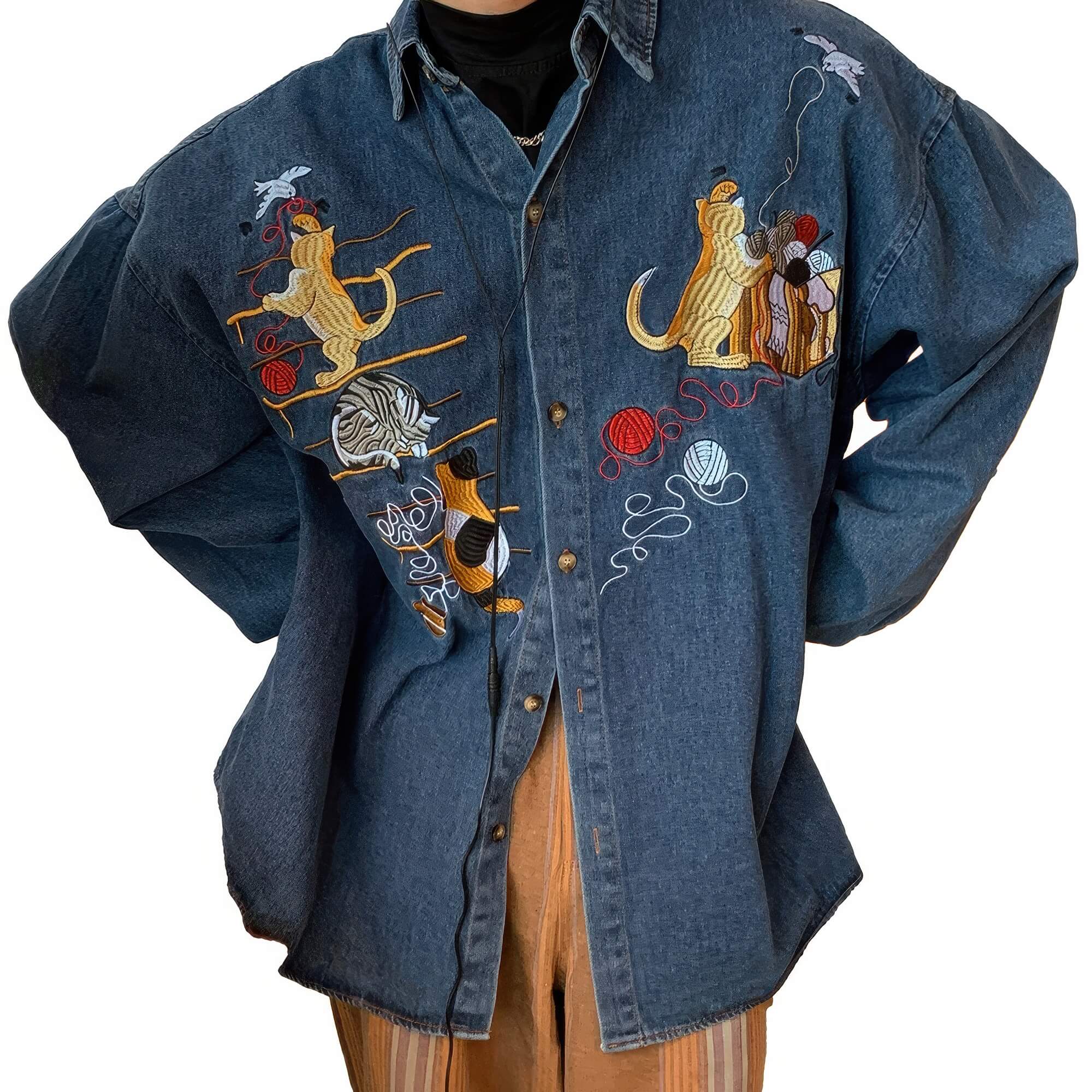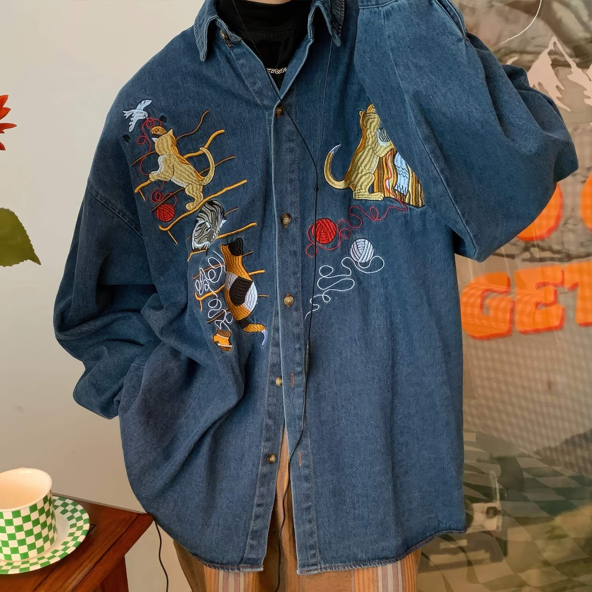 Buy Cats With Yarn Embroidery Denim Shirt Unisex Retro Y2K at Y2K Aesthetic Shop with Fast Free Shipping in the US, UK, AU and Worldwide