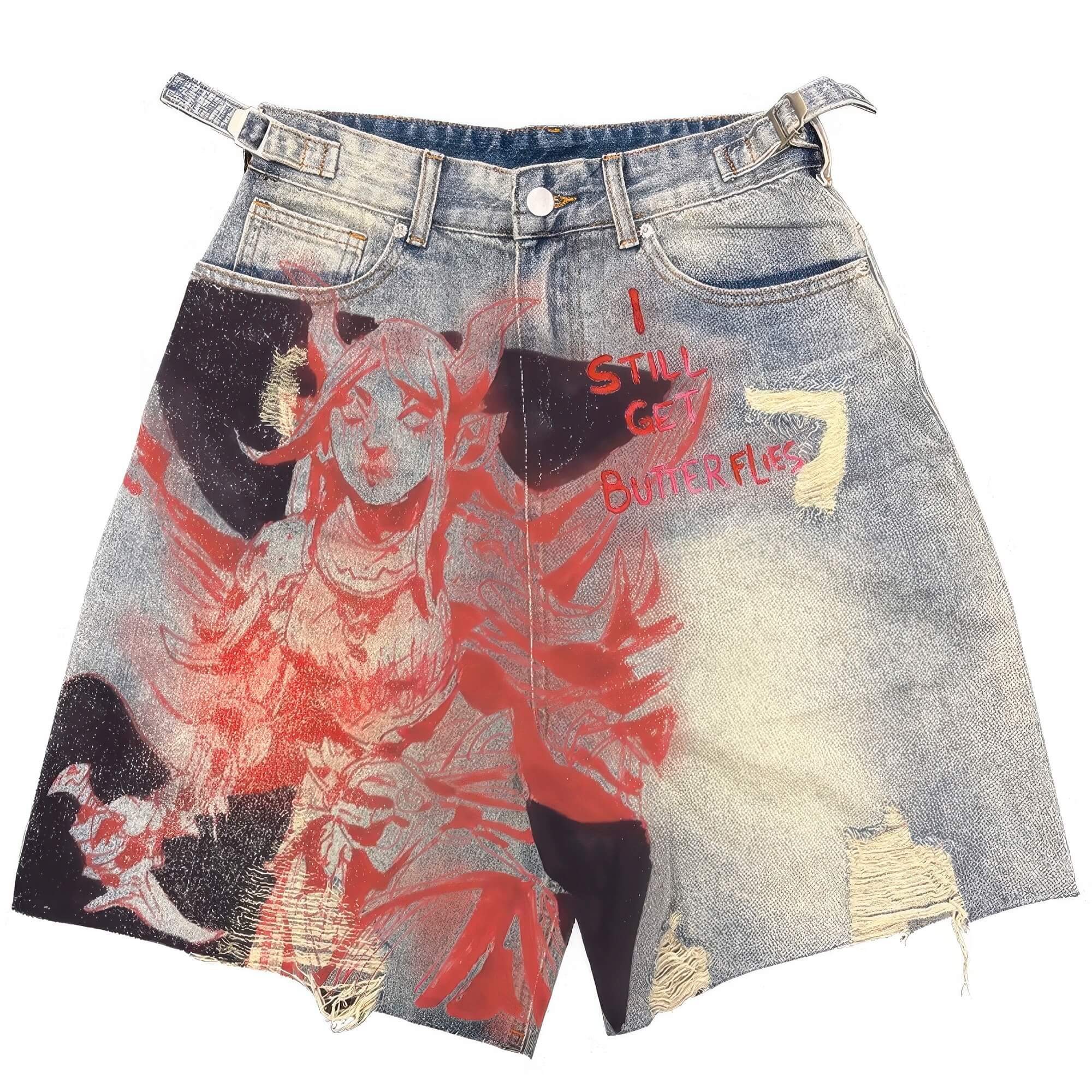 Buy Red Y2K Anime Demon Girl Drawing Denim Shorts Unisex at Y2K Aesthetic Shop with Fast Free Shipping in the US, UK, AU and Worldwide