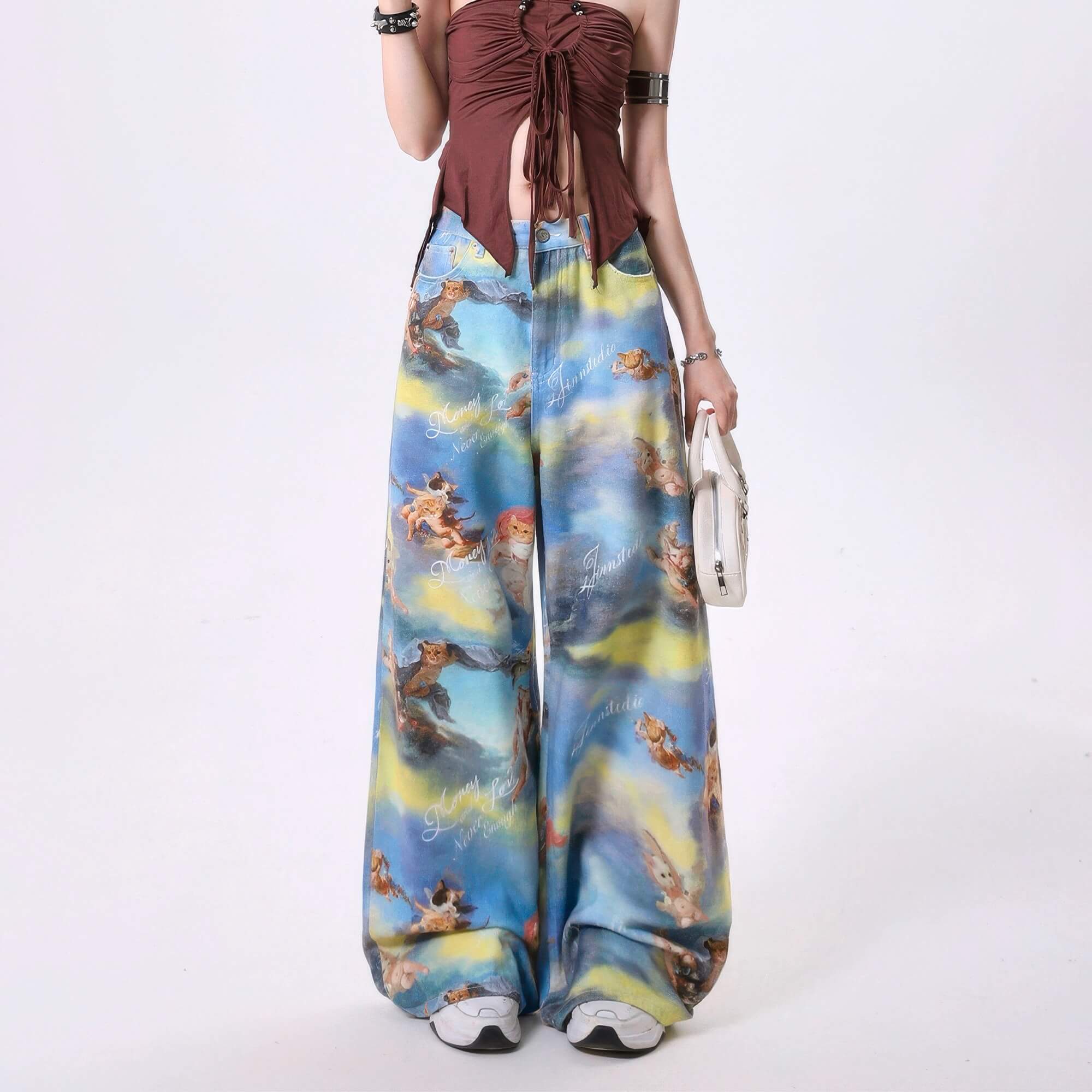 Buy Y2K Angel Cats Painting Wide Leg Women's Jeans at Y2K Aesthetic Shop with Fast Free Shipping in the US, UK, AU and Worldwide